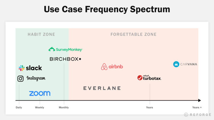 이렇듯 제품마다 고유의 사용 빈도를 가지고 있으며, 이를 하나의 스펙트럼으로 정리하면 아래와 같다(Reforge Use Case Frequency Spectrum)