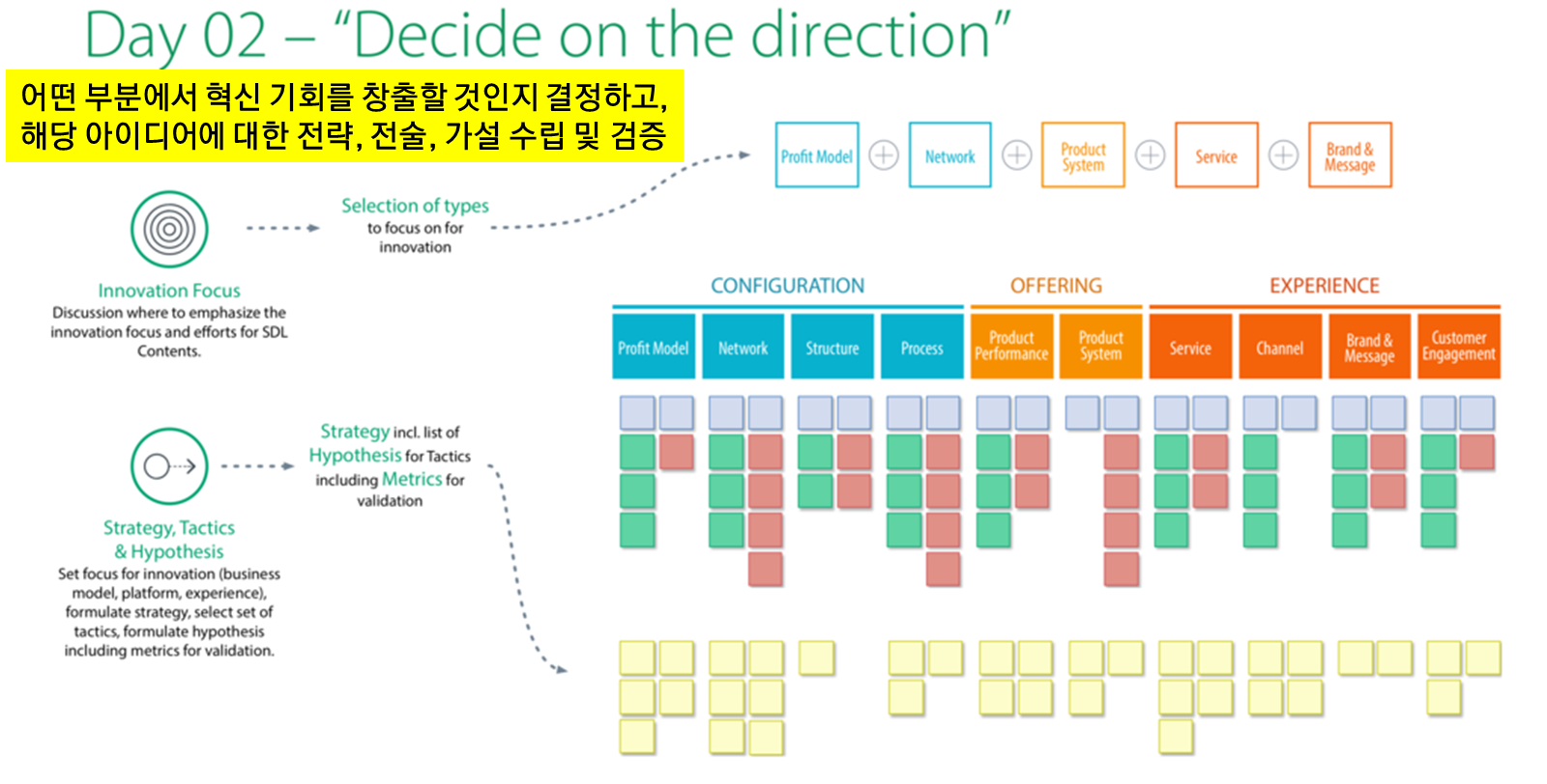 그리고 나서는 10가지 혁신 패턴을 하나 하나 살펴보면서 우리가 산업 또는 고객에게 어떤 혁신을 제공할 것인지 전략적 방향성과 방향에 대한 세부 전술 방향을 수립할 수 있다. 이때 혁신 아이디어는 가설 수준이기 때문에 사후에 반드시 검증해야 한다.