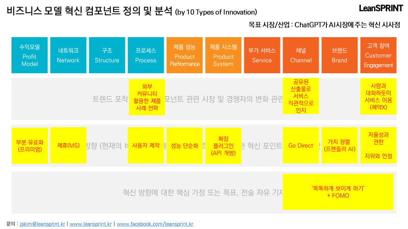 아래 예시는 2023년 1월부터 강하게 불고 있는 ChatGPT 유행에 대한 트렌드, 특정 산업(AI시장)에 주는 인사이트를 10가지 혁신 패턴을 중심으로 정리하여 코칭시장에서 AI를 활용한 '비대면 AI코칭 챗봇'이라는 아이디어를 발상하게 된 예시를 프레임워크에 맞춰 구조화한 샘플이다.