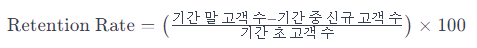 - 일반적인 계산식 : Retention Rate = {(기말 고객 수 - 기간 중 신규 획득 고객 수) / (기초 고객 수) * 100}