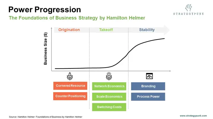 파워를 가진 기업으로써 그렇지 못한 기업 대비 산업 초과 수익을 창출하는데 기여하는 7가지 파워는 기업의 성장 단계별로 확보 또는 형성되거나 활용되는 시기가 각자 상이하다(파워의 발전 단계). 책의 저자 해밀턴 헬머는 파워의 발전 단계를 시간과 기업의 성장 정도를 기준으로 3가지로 구분했는데 바로 '발생(Origination)', '도약(Takeoff)', '안정(Stability)'다.