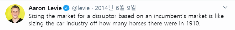 새로운 혁신 제품에 기존에 존재하는 시장 규모로 판단하는 것은 마치 1910년에 말의 수를 기준으로 자동차 업계의 규모를 예측하는 것과 비슷하다고 할 수 있다 (Box 창업자 애런 레비)