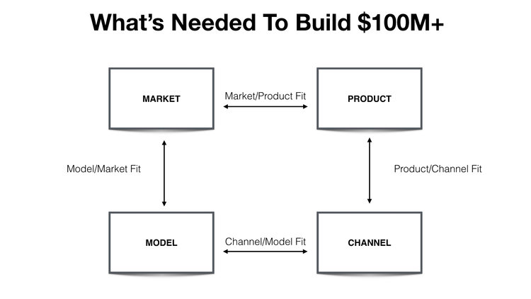 그럼 $1억 이상의 비즈니스를 키우기 위해서는 어떤 접근이 필요한가? 이에 대해 Balfour는 $1억 이상의 비즈니스로 성장하기 위해서는 다음 4가지 핏(Fit)을 달성해야 한다고 강조한다.