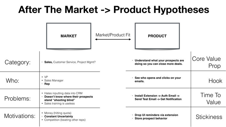 이후 과정은 Market에 대한 가설과 Product에 대한 가설이 실제로 맞는지 검증하는 것을 반복한다. Market-Product Fit은 어느 순간 검증이 됐다/안됐다의 이분법적 개념이 아니라 계속 향상되어 나아지는 동적 개념이라는 점을 인지해야 한다.