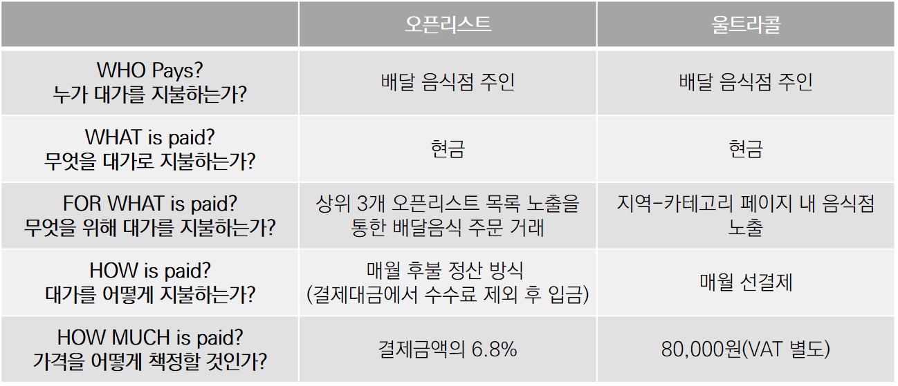 배달앱 '배달의민족'의 주 수익원인 '오픈리스트'와 '울트라콜'을 수익모델 프레임워크를 기반으로 구조화하면 아래와 같다.