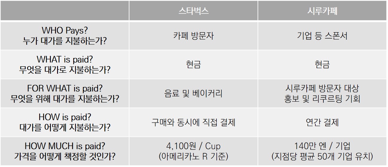 대표적인 카페 브랜드 스타벅스와 시루카페 간 수익모델을 수익모델 프레임워크를 가지고 비교하면 아래와 같다.