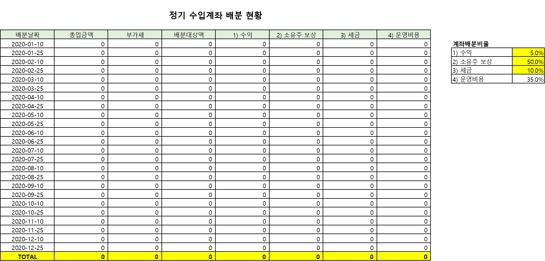 3) 매월 10일, 25일 사전에 약정한 배분비율로 정산한다(1번 통장 잔고 0원)