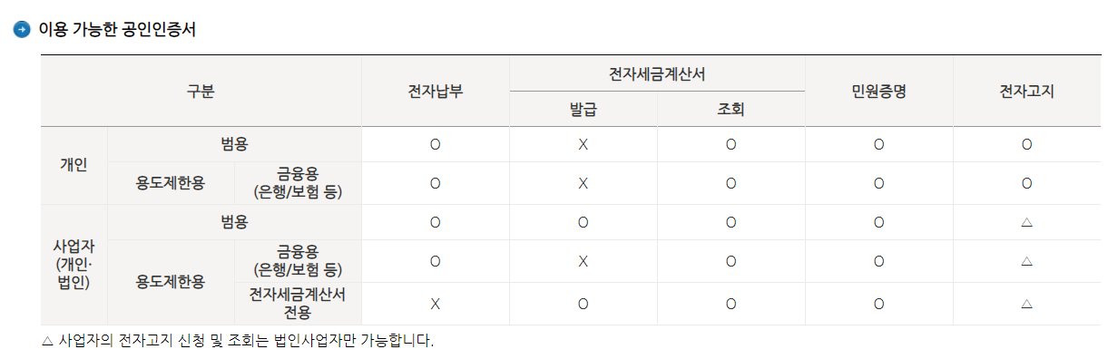 다만, 개인사업자인데 홈택스 회원가입을 사업자등록번호로 한 것이 아니라 개인 주민등록번호로 가입한 경우에는 해당 계정에 사업자등록번호 기반으로 발급받은 전자세금계산서용 범용공인인증서를 추가로 등록하지 못한다.
