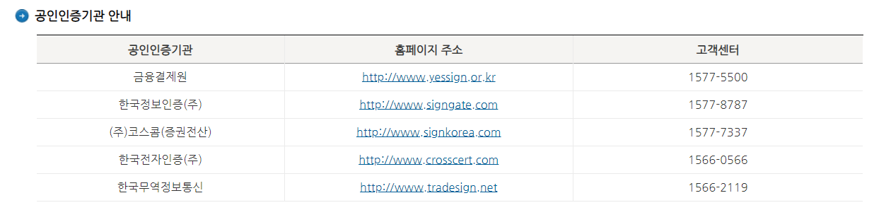 공인인증서 발급을 주관하는 기관은 아래와 같이 5군데이다. 아마 이 5군데 중 한 군데에서 인증한 공인인증서를 발급받을 수 있는데, 필자는 이 중 한국정보인증(주)에서 전자세금계산서 전용 공인인증서를 발급받았다.