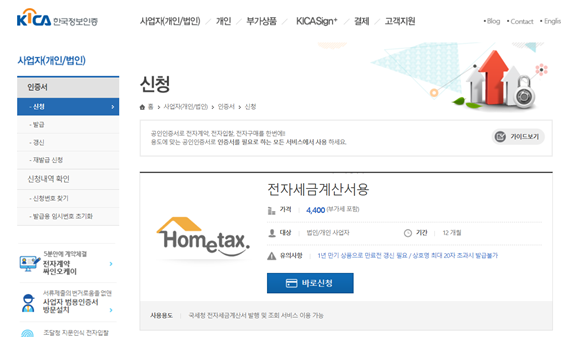 필자는 홈택스에서 전자세금계산서 발급을 위한 범용 공인인증서가 필요하다는 것을 인지했고, 홈택스 공인인증서관리 화면에 보이는 5개 공인인증기관 중에 2번째 링크인 한국정보인증(주)(사인게이트, signgate.com)을 클릭해서 들어갔다.