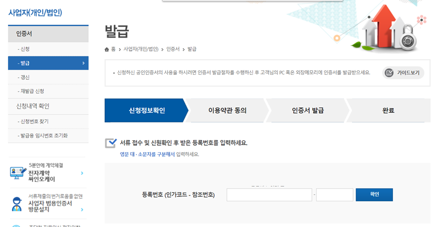3) 발급받은 확인증에 적힌 등록번호/참조번호로 최종 전자세금계산서 발급을 위한 범용공인인증서 발급