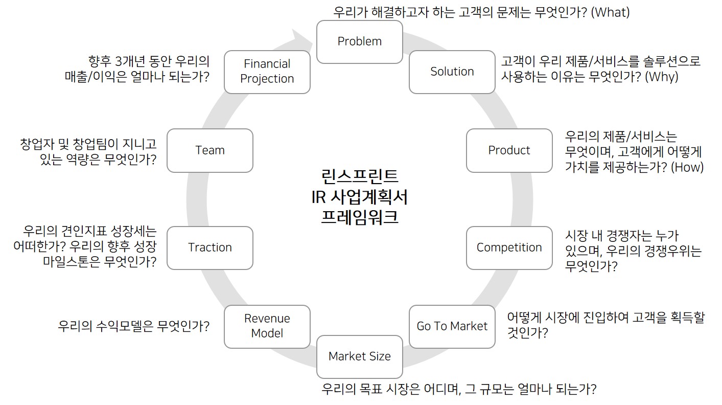 이렇게 추려낸 가설 중에서도 우선순위를 정하거나 혹은 가설의 양 자체가 많지 않은 경우에는 IR 사업계획서 프레임워크 상에서 우선하는 순서에 해당하는 가설을 중심으로 검증하는 방법이 있다. IR 사업계획서 상의 순서가 곧 사업모델을 평가하는 사람이 가장 궁금하고 듣고 싶어 하는 이야기고 해당 부분이 완전히 납득되지 않으면 대개 뒷부분이 의미가 없기 때문이다.