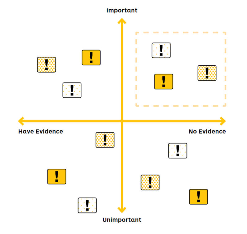 증거와 중요성을 기준으로 2x2 맵을 그린 후 도출된 가설을 맵 위에 표기한다.