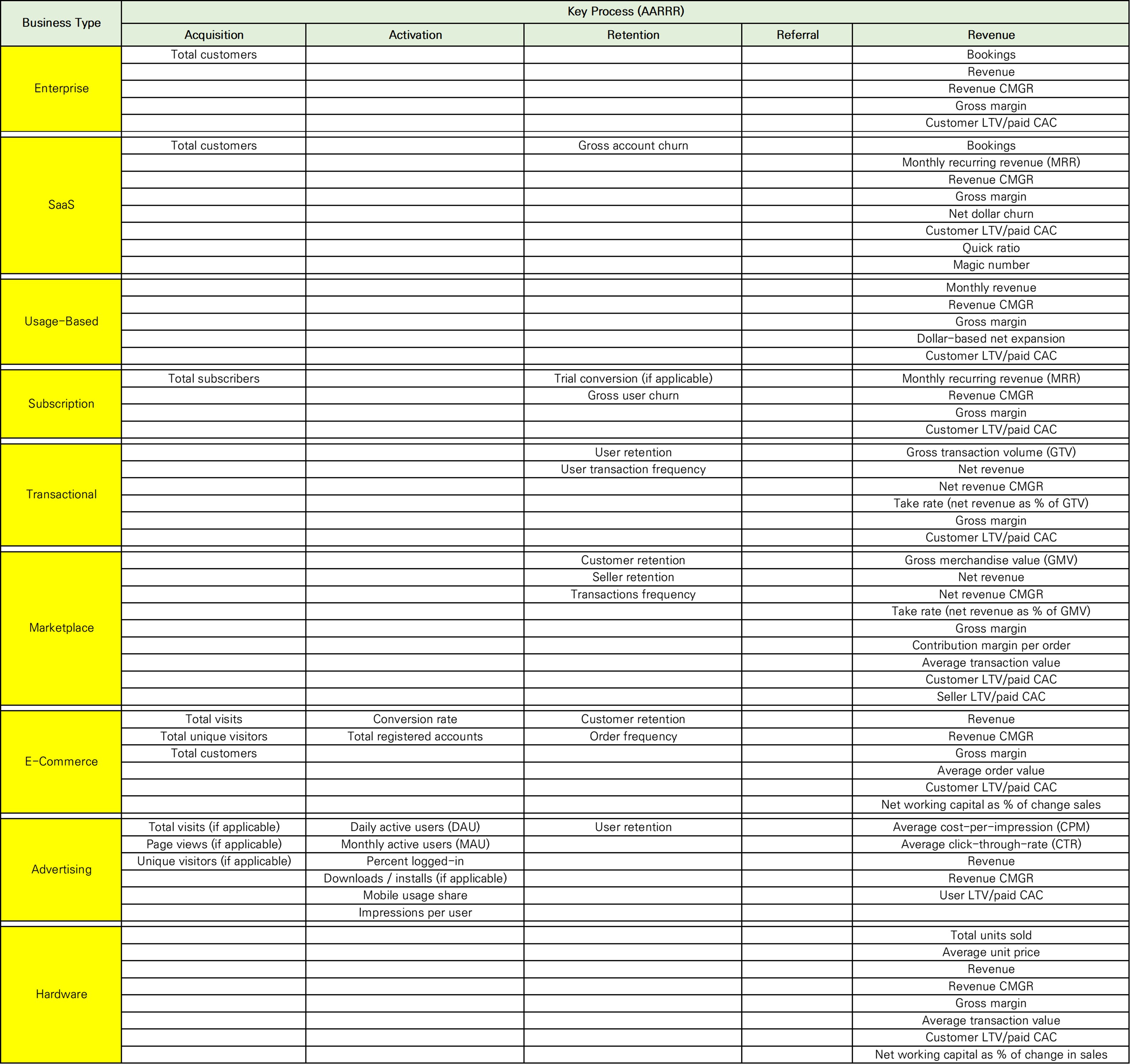 Y-Combinator의 <Series A Guide>에서 분류한 10가지 비즈니스 유형 중 Moonshot/Hard Tech/Biotech 유형을 제외한 9가지 비즈니스 유형의 주요 지표를 대상으로 고객 창출에서 수익 발생까지 주요 단계별로 매핑해봤다.