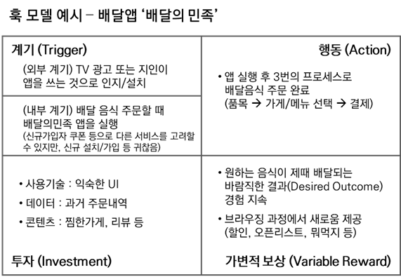 훅 모델을 통해 필자가 습관처럼 자주 쓰고 있는 '배달의민족'을 간단하게 분석해봤다.
