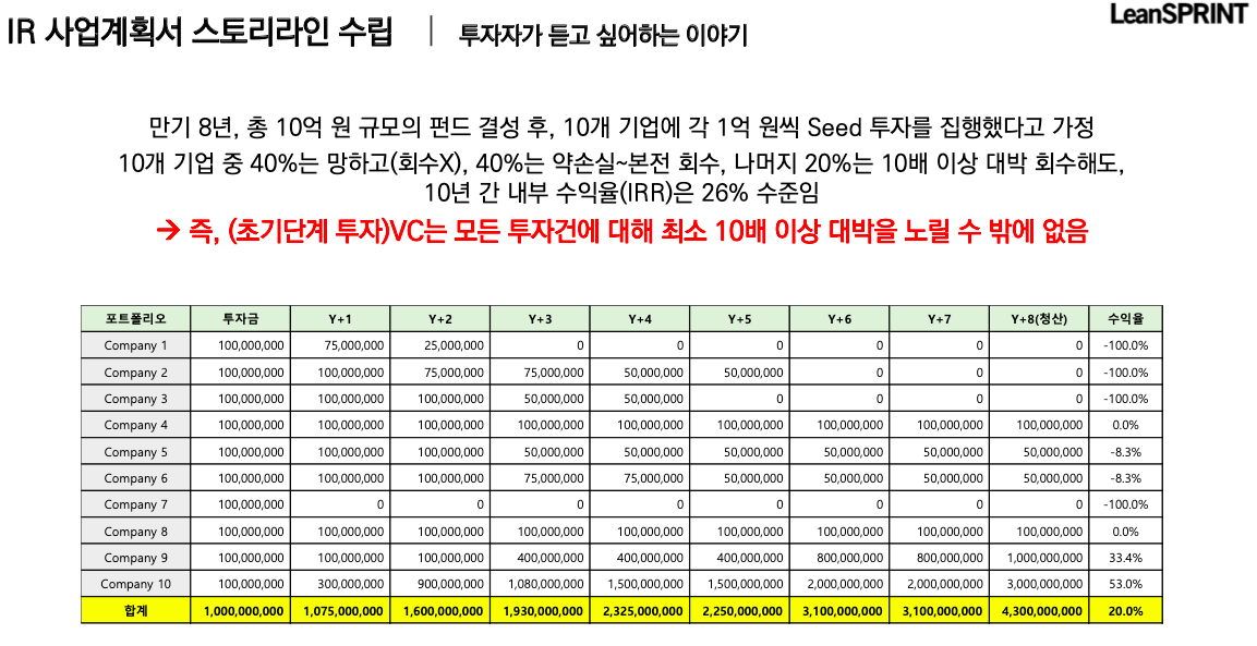 이제 갓 창업한 초기 스타트업에 투자를 한다는 것은 보통 투자금의 원금도 돌려받지 못할 경우가 70%가 기본인 매우 위험한 투자다. 그렇기 때문에 스타트업에 투자하는 투자자는 5~6년에 걸쳐 원금의 2~3배를 기대하지 않는다. 왜냐하면 보통 벤처캐피탈에서 펀드 하나가 조성되면 하나의 기업에 몰빵하는 것이 아니라 10개 내외의 기업에 나눠서 투자하며 나름이 투자 포트폴리오를 구성하는데, 이 10개 중 절반 이상은 원금을 회수 못하는 상황이 오더라도 1~2개 투자 기업에서의 수익으로 우수한 수익률로 만들어서 출자자에게 돌려줘야 하기 때문에 특히 초기 단계 투자자의 경우 개별 투자건에 대해 최소 10배 이상의 회수가 기대되는 기업에 대해 투자할 수밖에 없다.