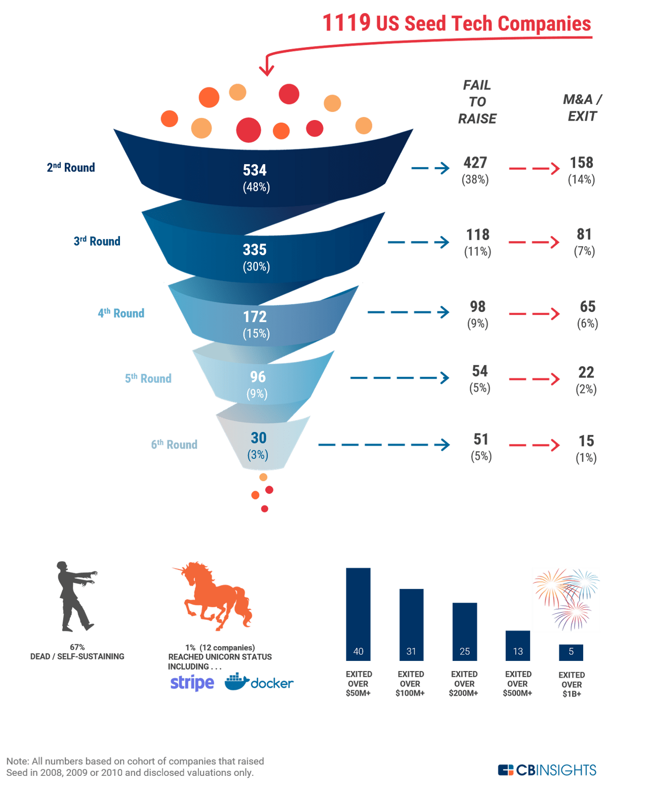 하지만, 사업을 시작하고 확장하는데 있어서 스스로 융통할 수 있는 돈이 아닌 외부 투자자로부터 막대한 자금을 유치하고자 할 경우 문제가 된다. 투자자는 창업자의 사업계획에 본인이 리스크를 짊어지고 투자를 한다. 근데 그 리스크가 많이 크다. 미국의 스타트업 전문 DB사이트인 CB Insights에 따르면 미국에 시드투자를 받은 1,100여 개의 스타트업 중 67%가량이 망하거나 겨우 스스로 생존하는 수준으로 투자금의 대한 Exit에 실패한다고 한다.