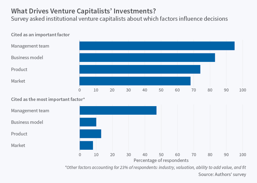 VC가 투자 결정 프로세스를 수행하면서 가장 우선적으로 고려하는 요소는 무엇일까? 통상적으로 VC가 투자 결정하는데 고려하는 요소로는 창업자(팀), 비즈니스 모델, 시장(규모), 산업, 적절한 가치평가 등이다. 아티클의 연구에 따르면, VC가 투자 추진하는데 가장 우선적으로 고려하는 것이 '창업자'였으며, 그 뒤를 비즈니스 모델, 시장, 산업, 가치평가가 따랐다.
