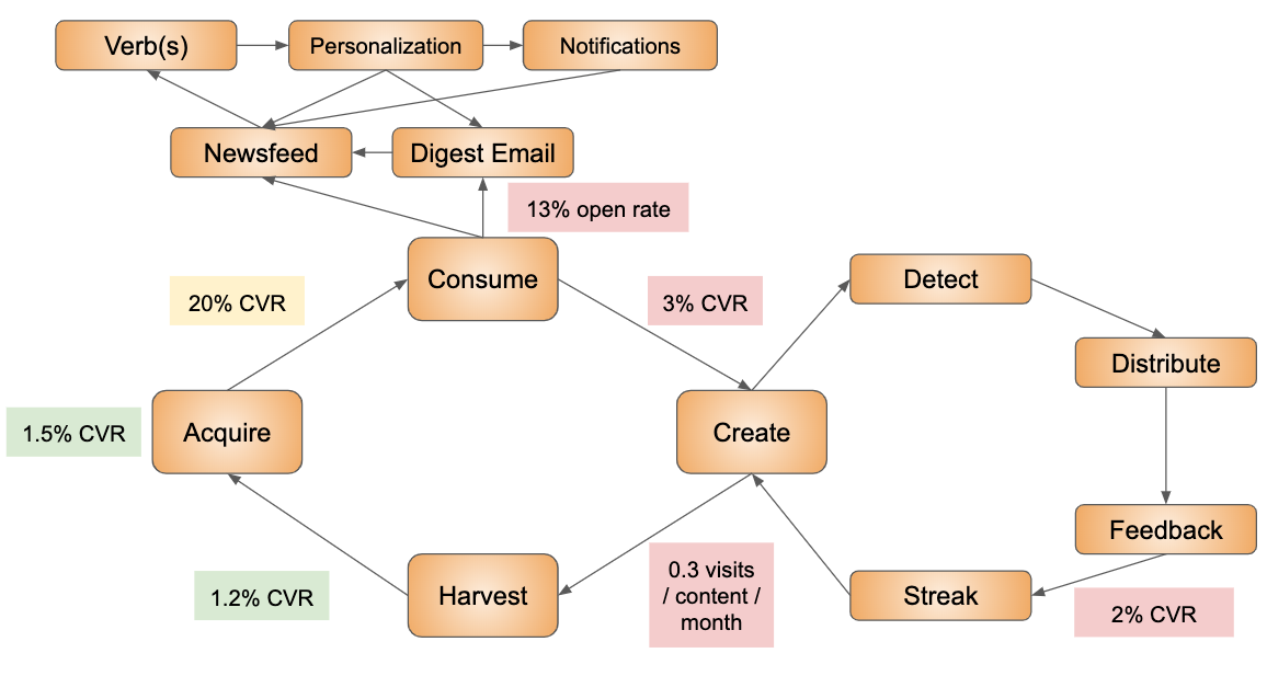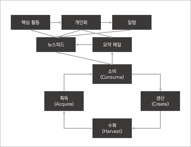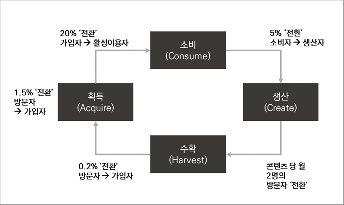 사용자를 획득하고, 콘텐츠 소비, 생산, 그리고 생산된 콘텐츠가 유기적으로 다른 사용자/트래픽을 창출하는 기본적인 흐름의 기본 플라이휠의 핵심 요소는 획득(Acquire), 소비(Consume), 생산(Create), 수확(Harvest)다.